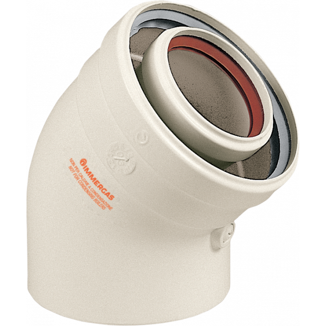 Колено дымохода конденсационное 45 градусов 60/100 (CE.00.30 C) предназначено для конденсационных газовых котлов Immergas. Коаксиальное колено имеет маркировку CE.00.30 C