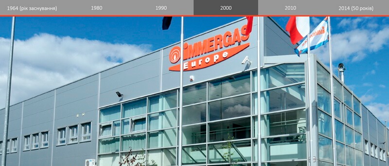 5 лютого 1964 на світ з'явилася компанія Immergas. Метою створення компанії послужило бажання поділитися своїми інноваційними ідеями в області опалювального обладнання і з їх допомогою зробити життя людей кращим. Сьогодні для тисяч наших інженерів і співробітників нічого не змінилося - ми продовжуємо зосереджувати свої зусилля на вдосконаленні наших заводів і технологій, зберігаючи італійські традиції. Спираючись на принципи і цінності компанії, ми розробляємо свої проекти, звертаючи пильну увагу на турботу про навколишнє середовище. Тим самим ми знову підтверджуємо і доводимо важливість співпраці з тими, хто продає, встановлює і надає сервісну підтримку обладнання Immergas. Сьогодні, як і понад 50 років тому, наші ідеї народжують проекти, які спрямовані на поліпшення майбутнього, який передбачає комфорт, безпека, надійність і турботу про навколишнє середовище.